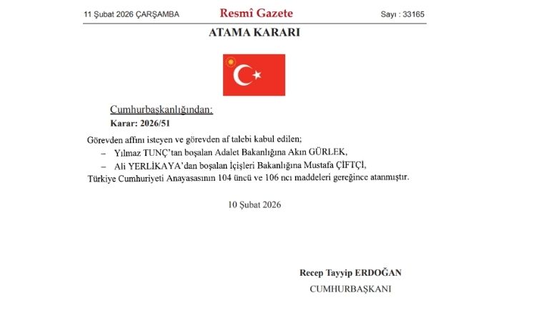 Cumhurbaşkanlığı tarafından yapılan üst düzey atama kararları, 11 Şubat 2026 tarihli Resmî Gazete’de yayımlanarak yürürlüğe girdi. Yayımlanan kararla birlikte Adalet Bakanlığı ve İçişleri Bakanlığı’nda görev değişimi yaşandı.